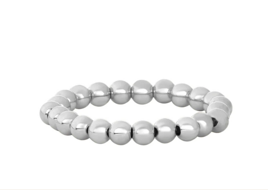 No se deslustra y es resistente al agua. Ensartado en un cordón elástico, que ofrece un ligero estiramiento.