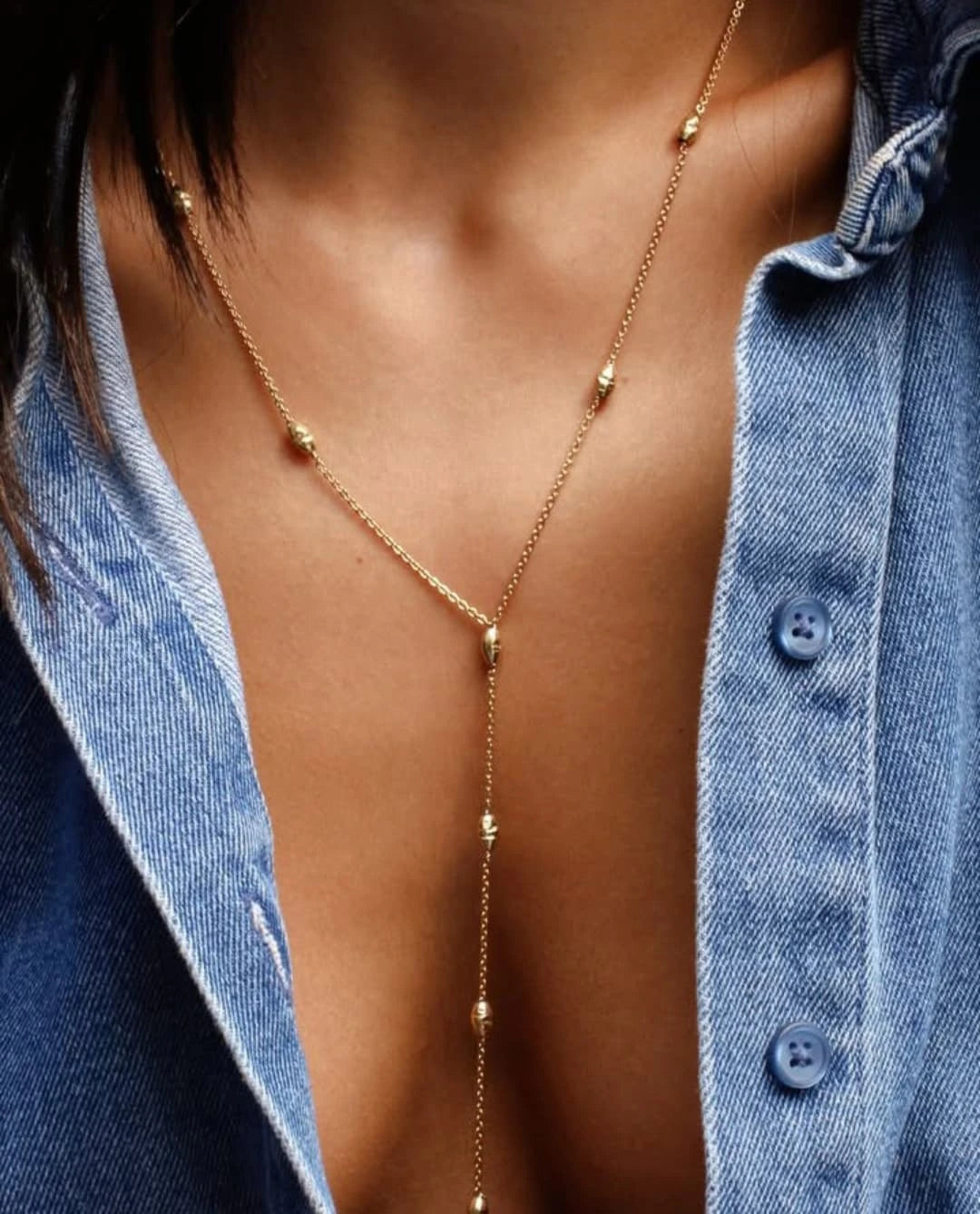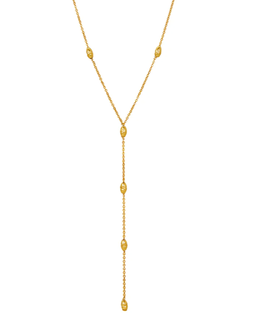 Cadena rectangular rellena de oro de 14k con 10 cuentas de orzo texturizadas rellenas de oro y terminada con una extensión de 2"