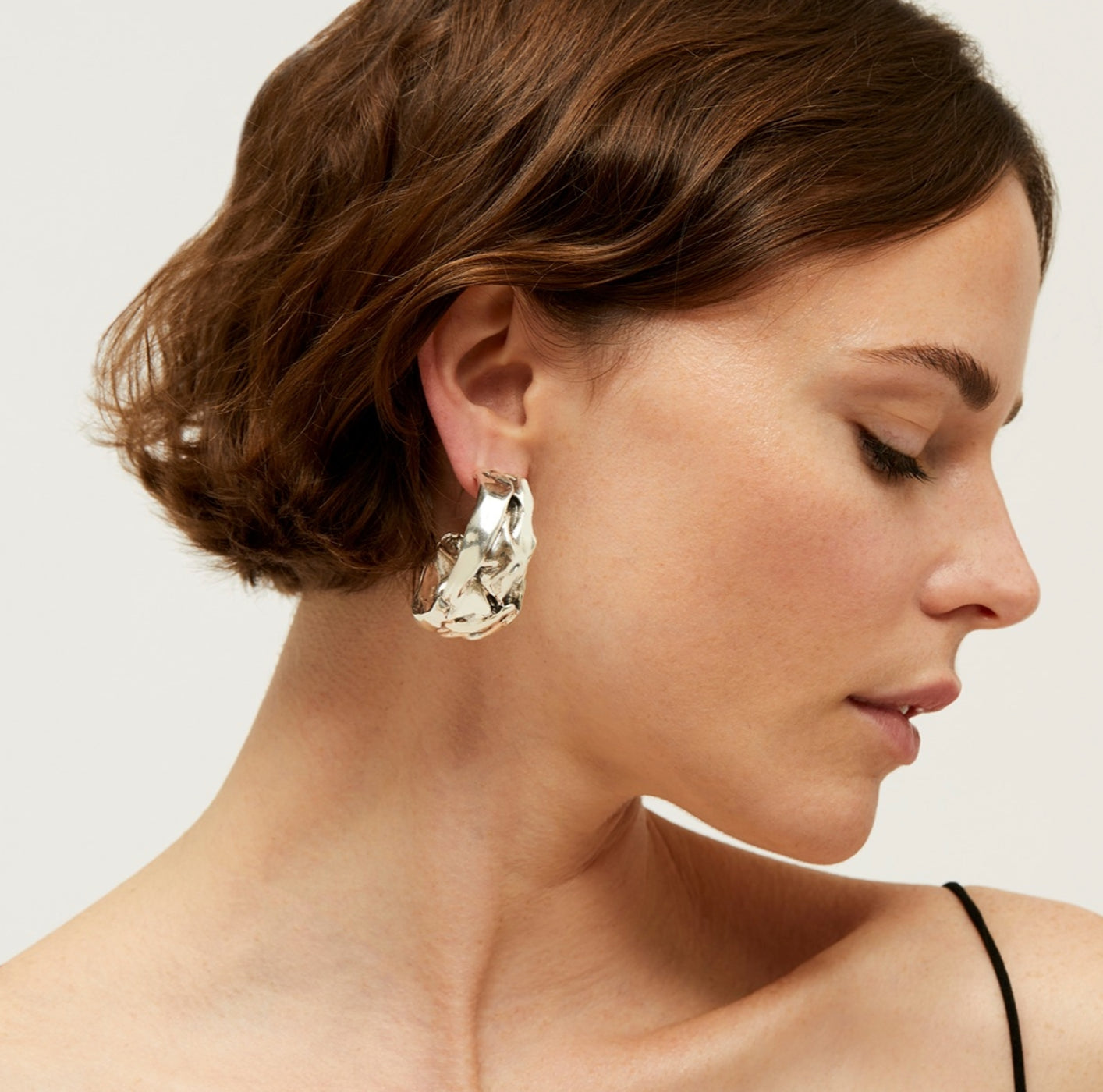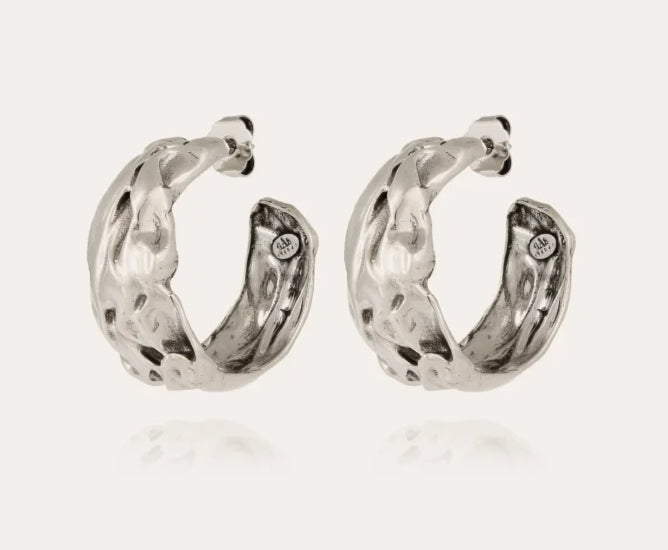 Pendientes de aro de plata de compresión con un efecto comprimido, como esculpidos en plata.