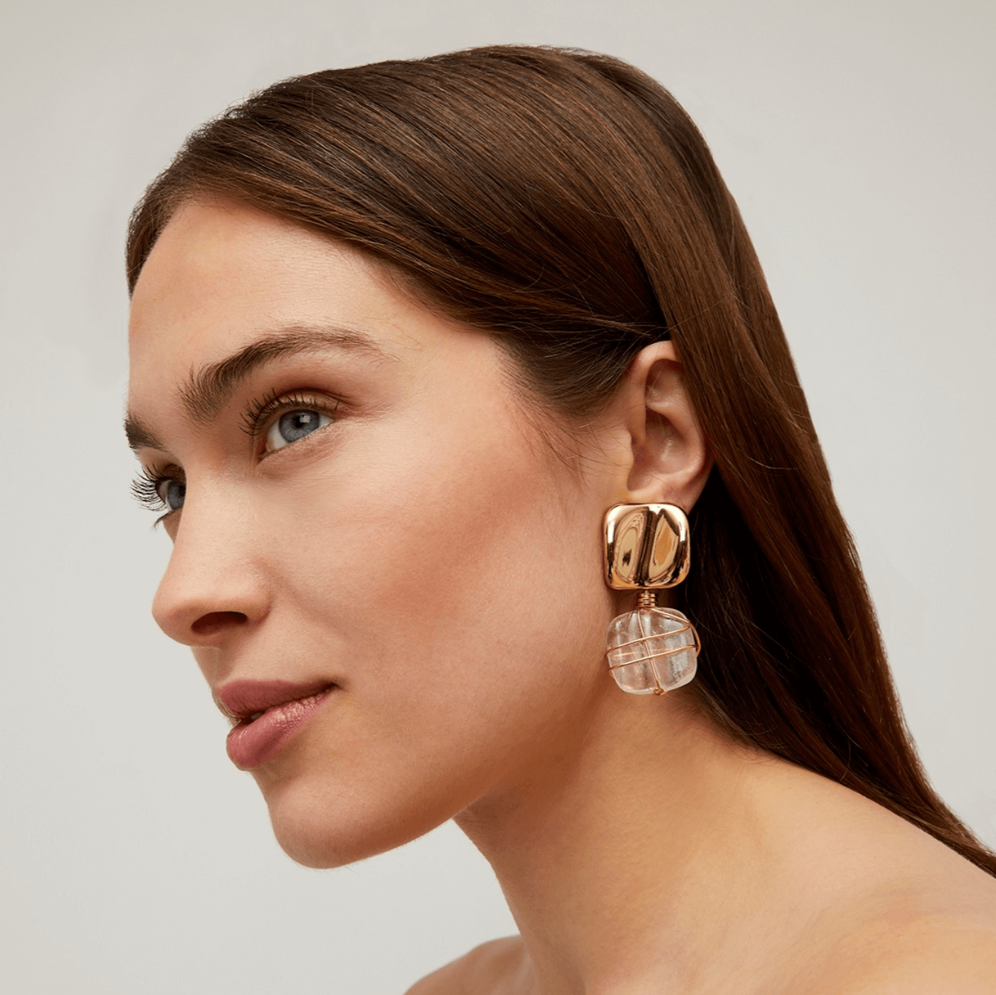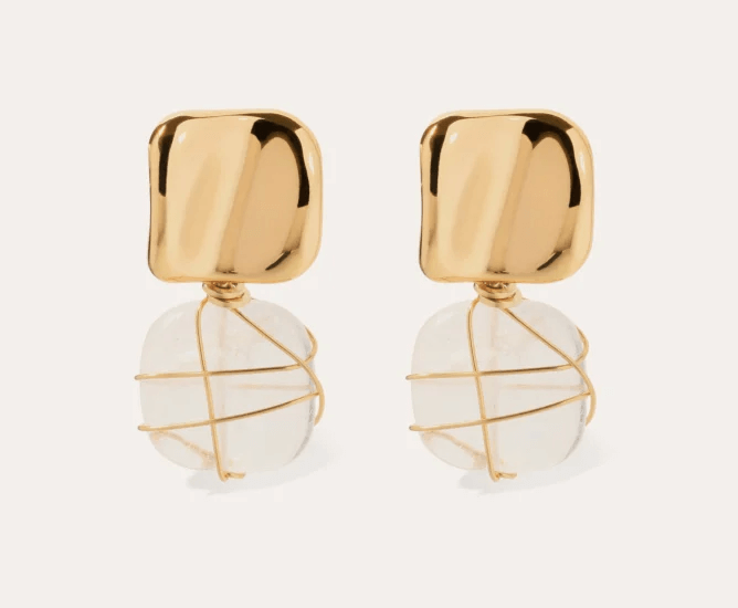 Estos finos pendientes colgantes bañados en oro realzan una delicada piedra de cristal de roca , símbolo de pureza y sabiduría, suspendida de una pieza