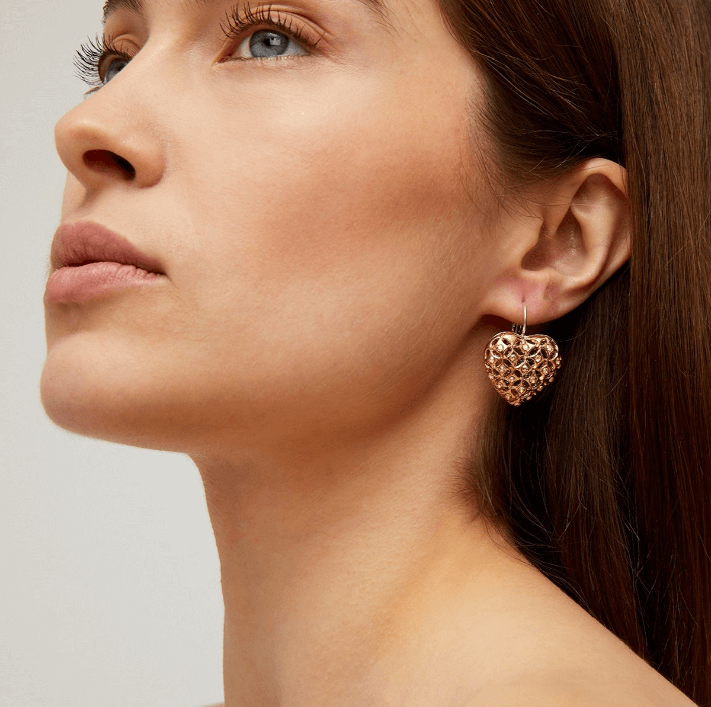 El corazón abovedado y filigranado, adornado con brillantes diamantes de imitación, revela un sutil brillo. Dorada con oro fino y plata en la parte posterior, esta