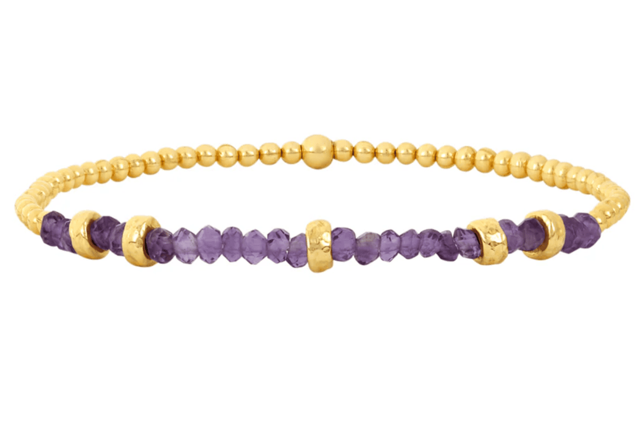 Cuentas de 2 mm rellenas de oro amarillo de 14 k con 2,25" de piedras preciosas de amatista y cinco rondelles martillados de oro amarillo de 14 k.