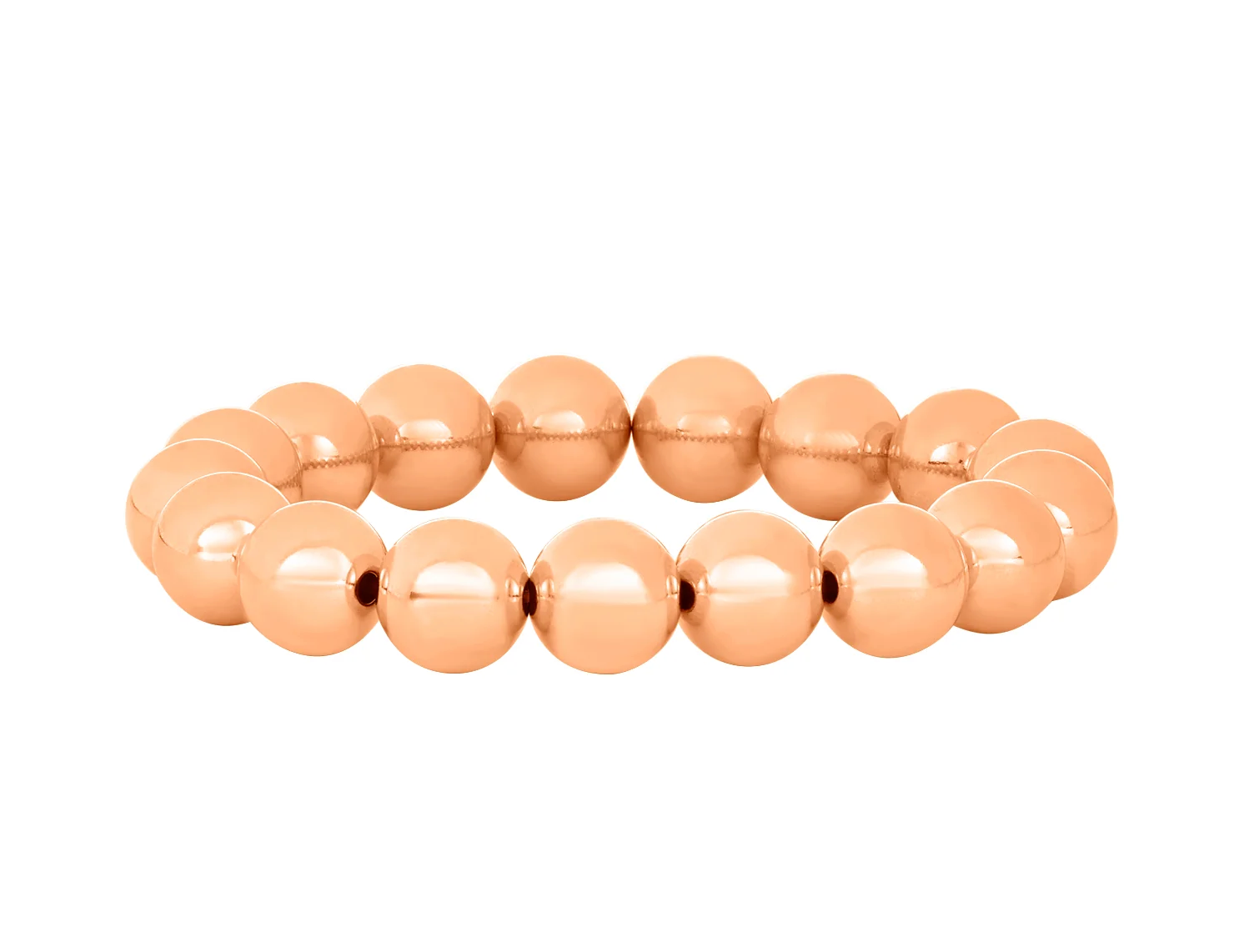 Oro rosa. No se deslustra y es resistente al agua. Ensartado en un cordón elástico, que ofrece un ligero estiramiento.
