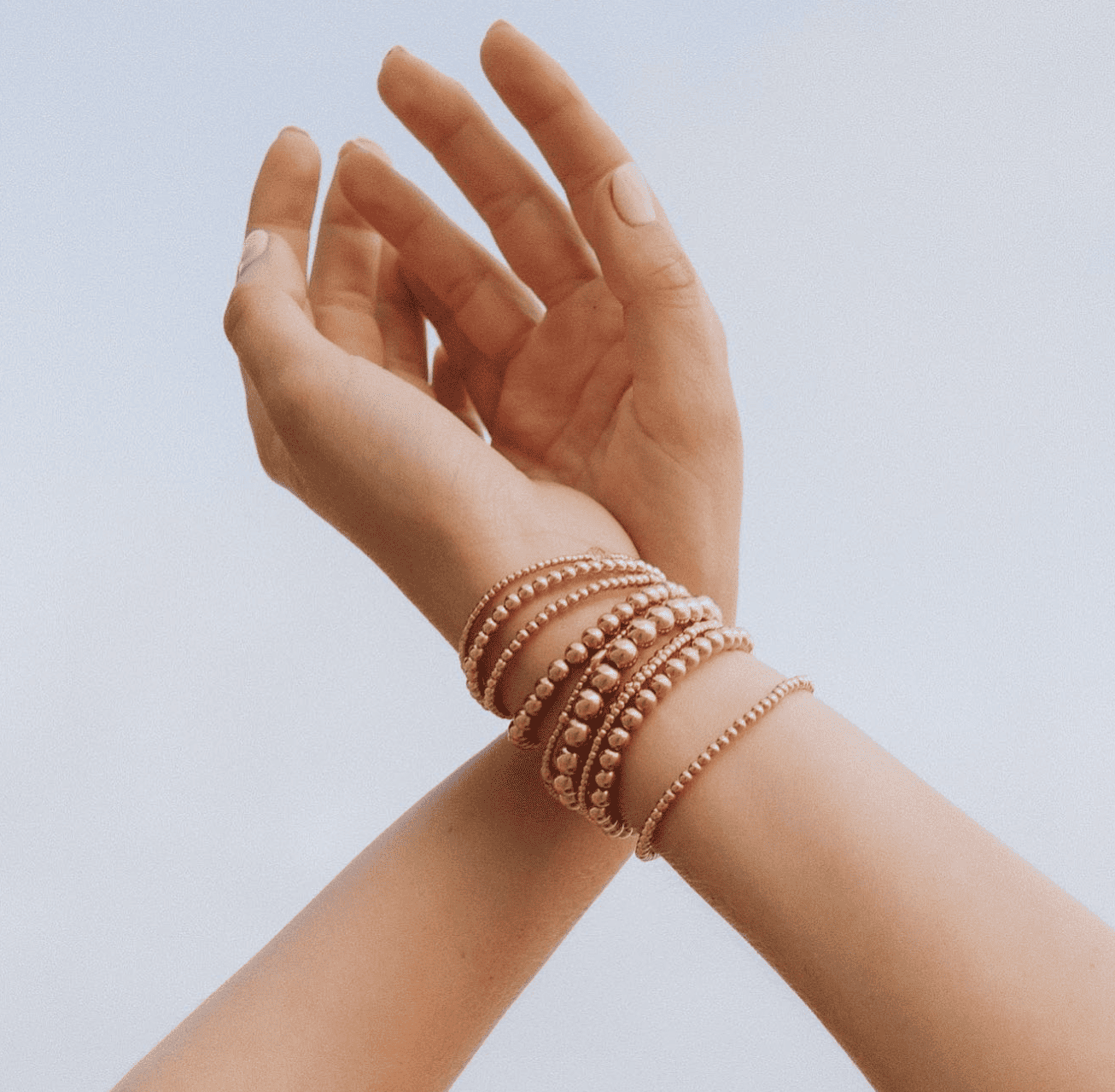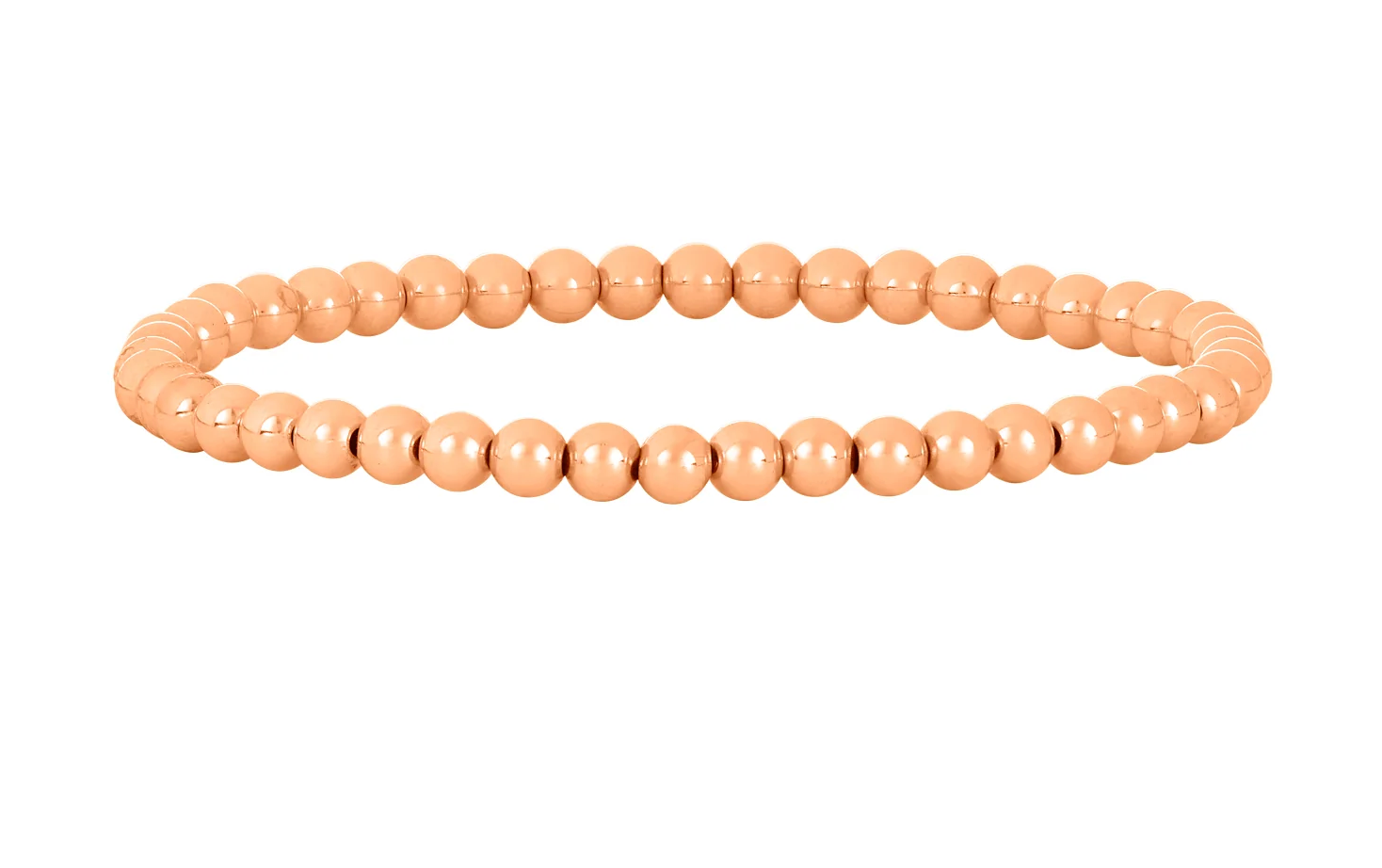 Oro rosa. No se deslustra y es resistente al agua. Ensartado en un cordón elástico, que ofrece un ligero estiramiento.
