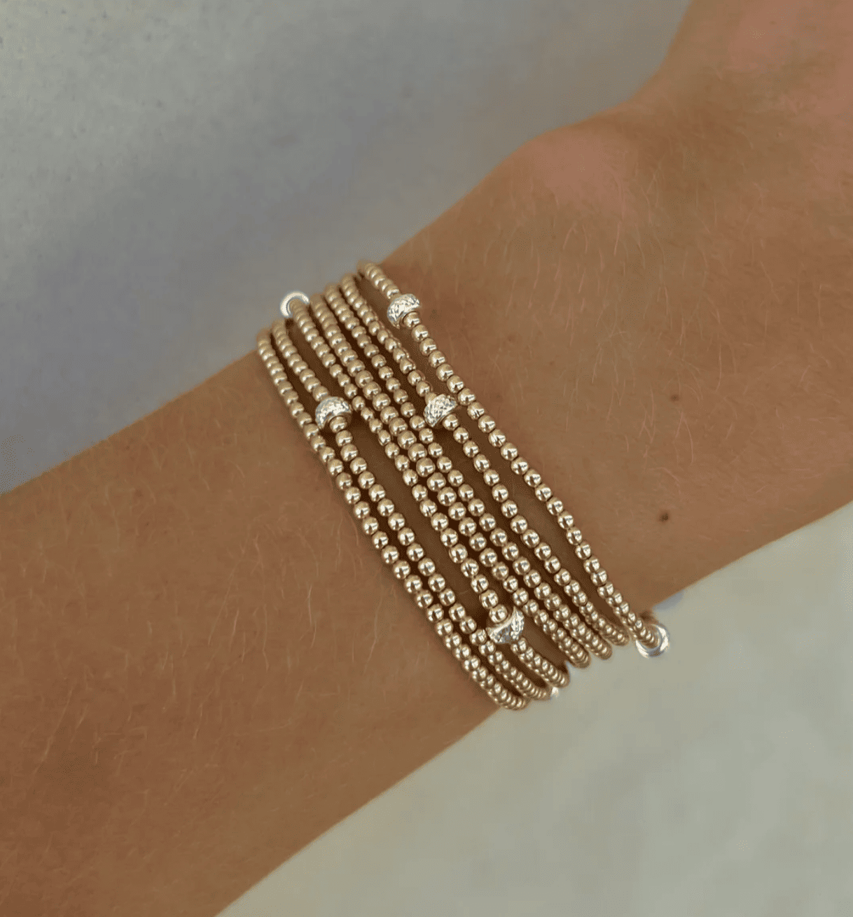 Las pulseras están ensartadas en un delicado y exclusivo cordón elástico. Cada pieza fabrica cuidadosamente con el cordón ideal según el tamaño de la cuenta, la gema y el ajuste deseado.