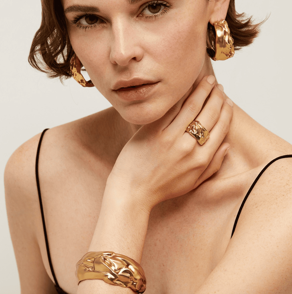 Brazalete de compresión bañado en oro fino, con un efecto comprimido, como si estuviera esculpido en oro. Talla ajustable