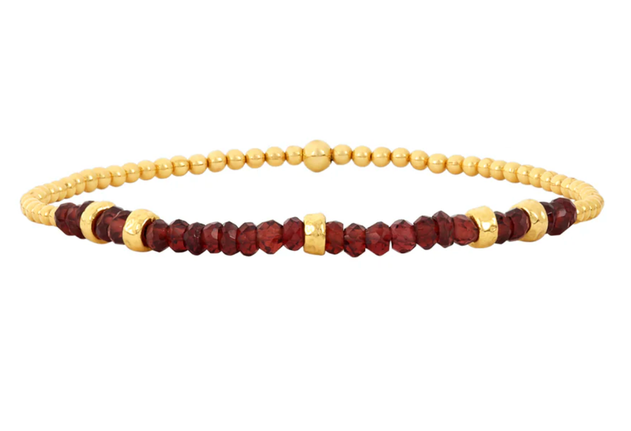 Cuentas de 2 mm rellenas de oro amarillo de 14 k con 2,25" de piedras preciosas de granate y cinco rondelles martillados de oro amarillo de 14 k.