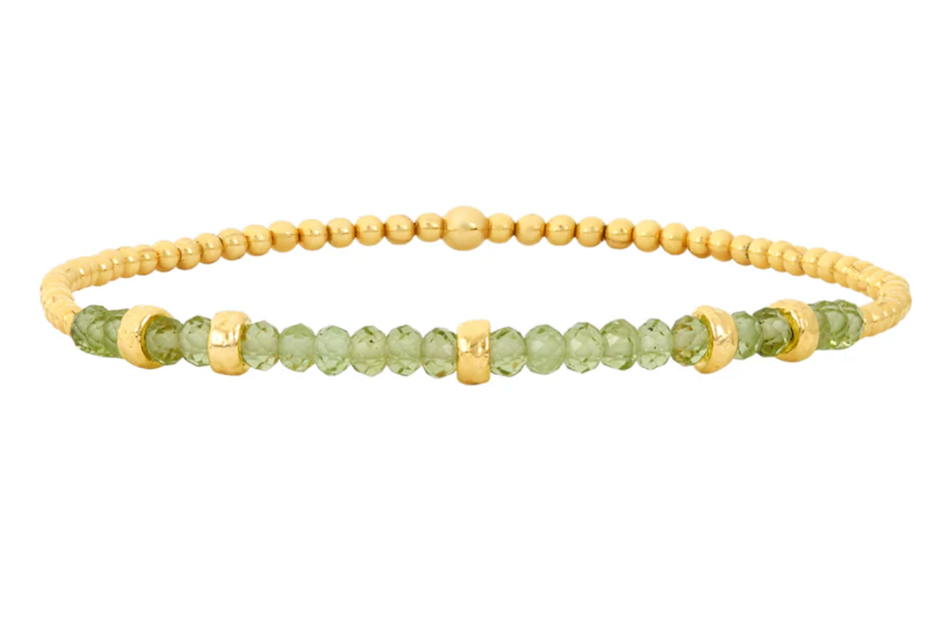 Cuentas de 2 mm rellenas de oro amarillo de 14 k con 2,25" de piedras preciosas de peridoto y cinco rondelles martillados de oro amarillo de 14 k.