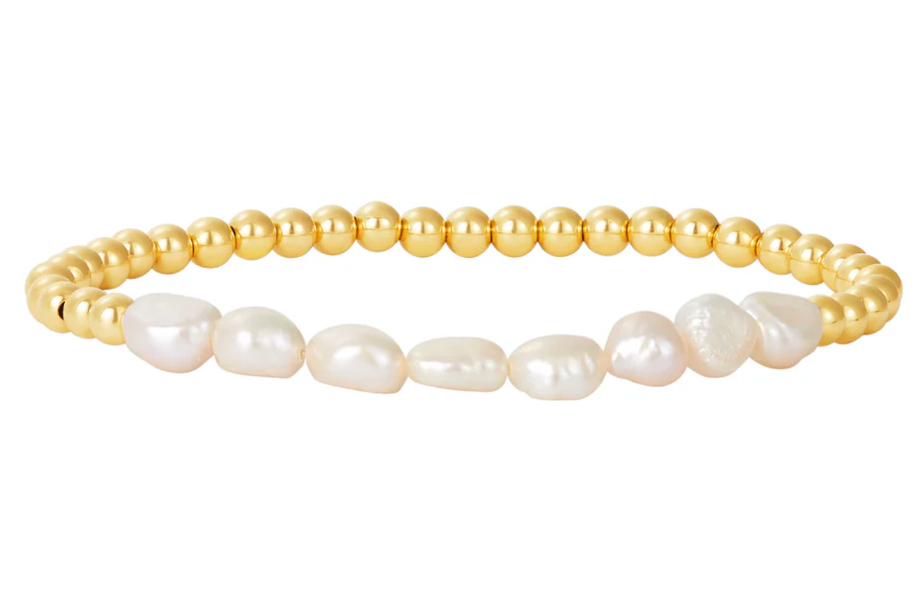 Cuentas rellenas de oro amarillo de 14 k con 2,25" de perlas barrocas de 6 mm. No se deslustra y es resistente al agua. Ensartado en un cordón elástico.