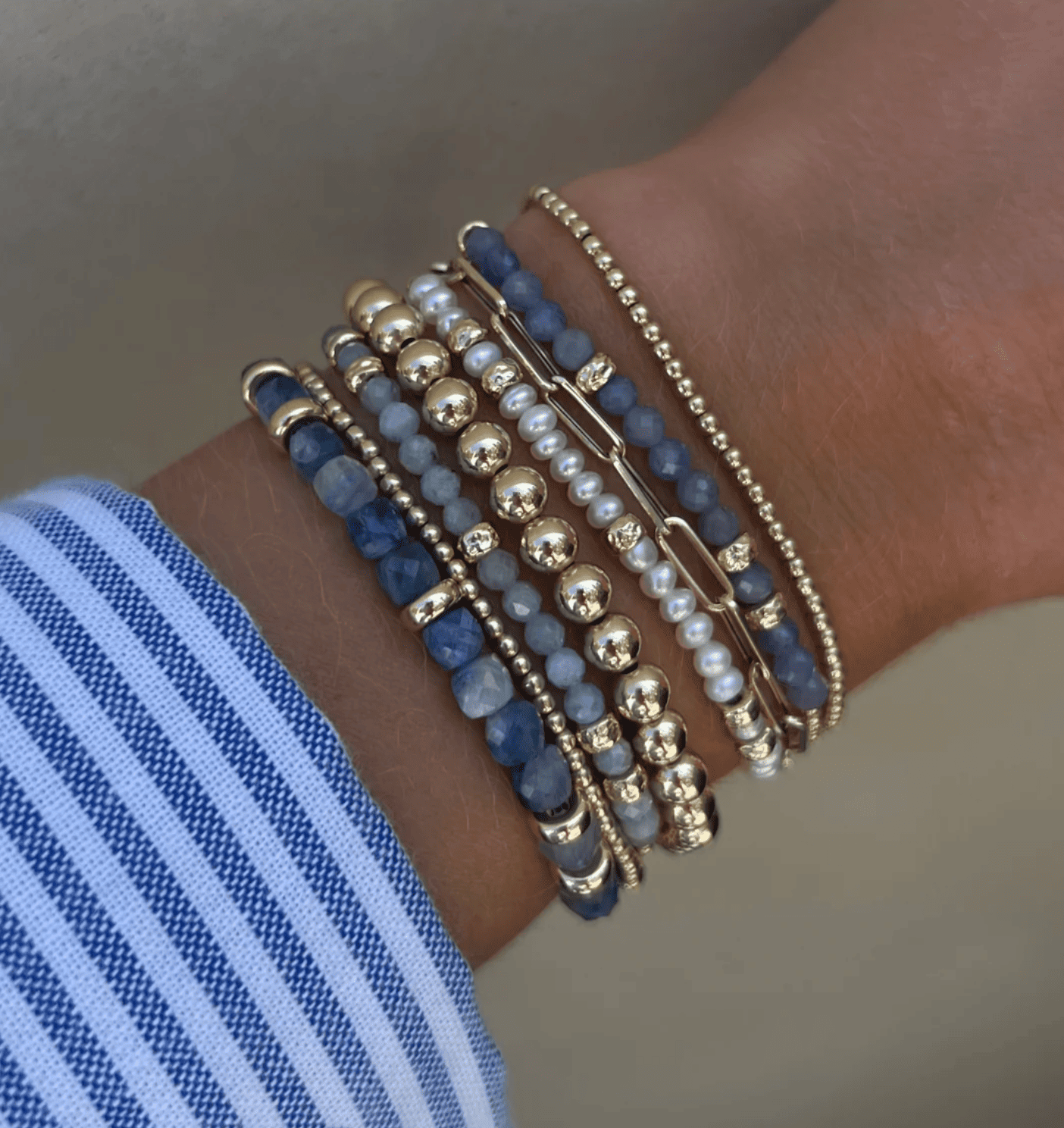Las pulseras están ensartadas en un delicado y exclusivo cordón elástico. Cada pieza fabrica cuidadosamente con el cordón ideal según el tamaño de la cuenta, la gema y el ajuste deseado.