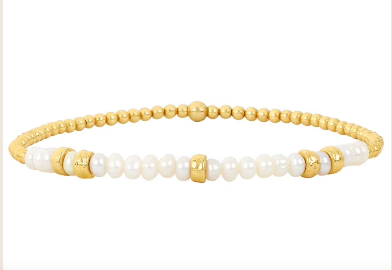 Cuentas de 2 mm rellenas de oro amarillo de 14 k con 2,25" de piedras preciosas de perla y cinco rondelles martillados de oro amarillo de 14 k