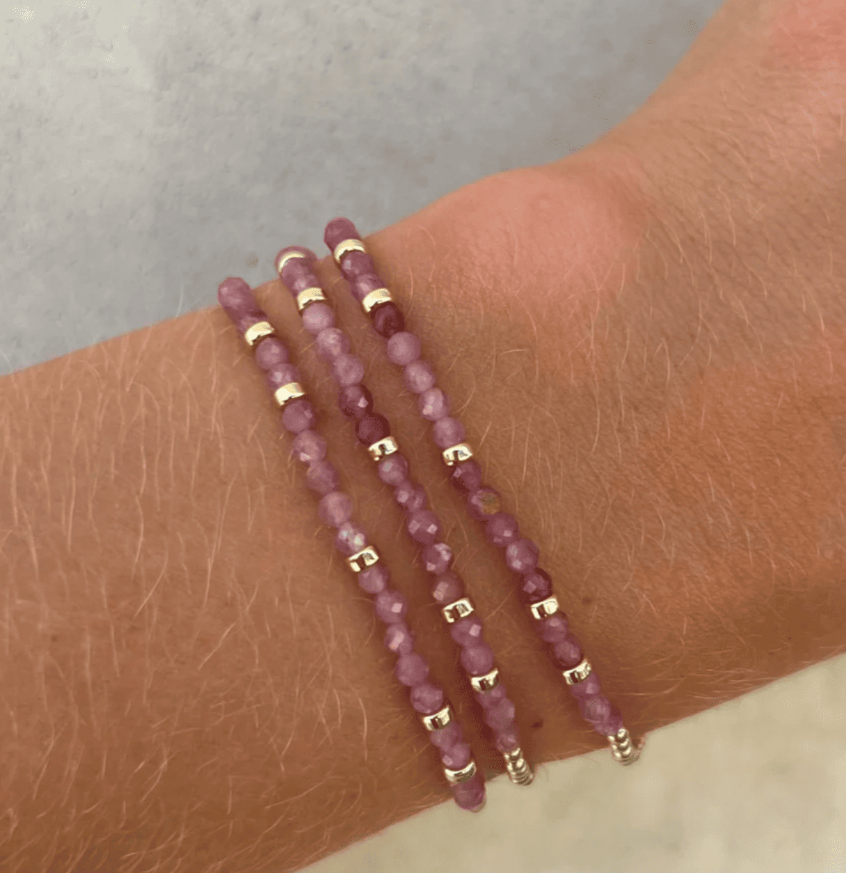Las pulseras están ensartadas en un delicado y exclusivo cordón elástico. Cada pieza fabrica cuidadosamente con el cordón ideal según el tamaño de la cuenta, la gema y el ajuste deseado.