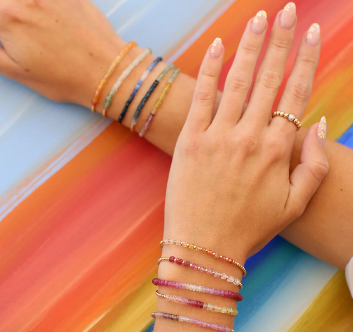Las pulseras están ensartadas en un delicado y exclusivo cordón elástico. Cada pieza fabrica cuidadosamente con el cordón ideal según el tamaño de la cuenta, la gema y el ajuste deseado.